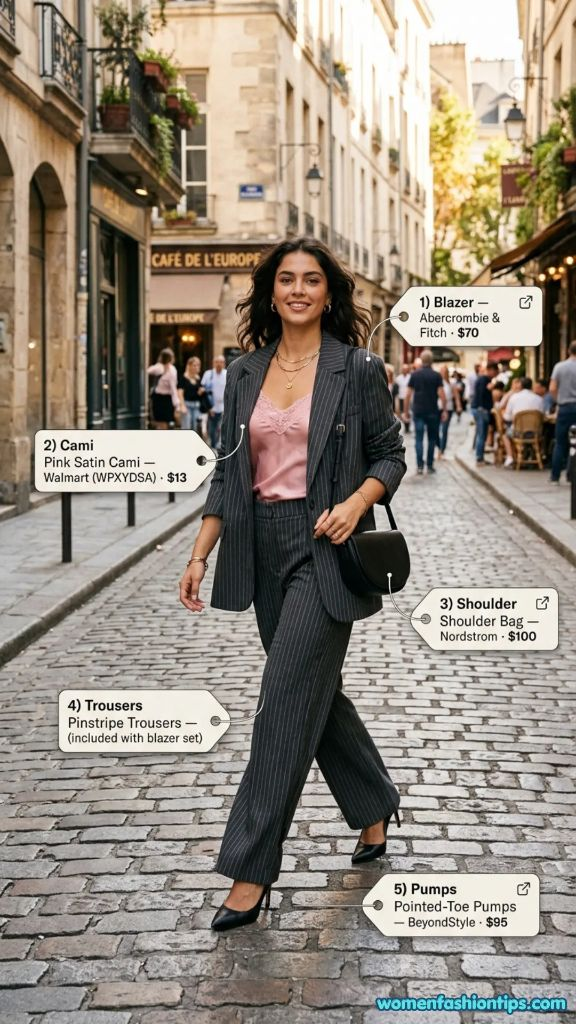 Abercrombie & Fitch has been delivering surprisingly sharp blazers at accessible price points, and their pinstripe options have a modern, slightly relaxed cut that doesn’t feel corporate. The satin cami underneath — even something as simple as a pink option from Walmart’s WPXYDSA line — creates that essential contrast between hard and soft. A structured shoulder bag from Nordstrom in black leather anchors the look, and pointed-toe pumps elongate the silhouette beautifully. BeyondStyle makes a pointed-toe pump that balances comfort with sleekness.