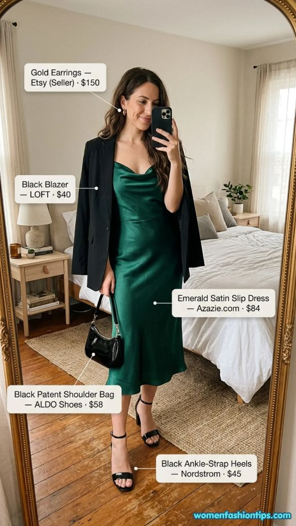 Shop This Look: The Emerald Satin Slip Dress is from Azazie.com at $84 — shop it here. The Black Blazer from LOFT at $40 — grab it here. The Gold Earrings from Etsy (Seller) at $150 — find them here. The Black Patent Shoulder Bag from ALDO Shoes at $58 — snag it here. And the Black Ankle-Strap Heels from Nordstrom at $45 — pick them up here.