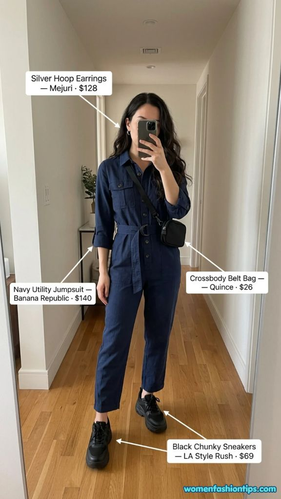 Shop This Look: The Navy Utility Jumpsuit is from Banana Republic at $140 — shop it here. The Crossbody Belt Bag from Quince at $26 — grab it here. The Black Chunky Sneakers from LA Style Rush at $69 — find them here. And the Silver Hoop Earrings from Mejuri at $128 — snag them here.