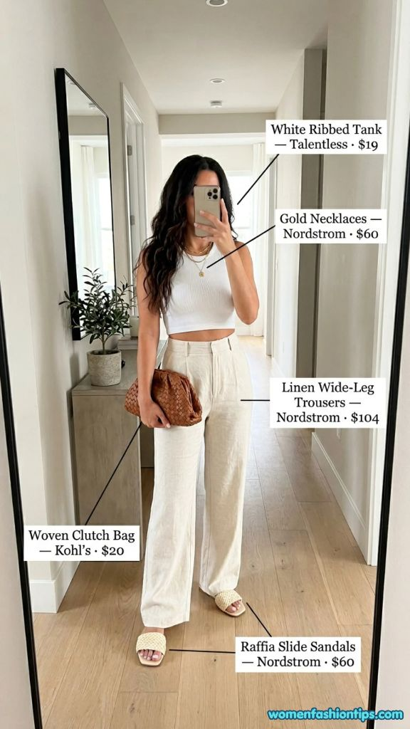 The ribbed tank from Talentless offers that snug, sculpted fit that works beautifully as a base layer. For the trousers, Nordstrom’s linen wide-leg options drape gorgeously and hold up remarkably well through a full day of wear — they don’t wrinkle as aggressively as cheaper linens, which is a real advantage in the heat. Raffia slide sandals, also from Nordstrom, keep the foot cool and the aesthetic cohesive. The woven clutch from Kohl’s is an affordable accessory that looks far more expensive than its price tag suggests.