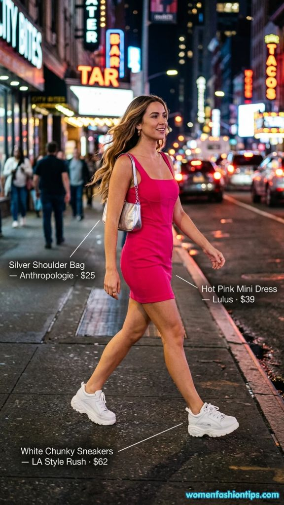 Lulus has been a go-to for affordable, well-fitting mini dresses, and their hot pink option is a standout. The fabric has enough stretch to move with you on a dance floor or a long walk through the city after dinner. White chunky sneakers from LA Style Rush provide comfort without sacrificing the statement — they actually amplify the playful energy of the dress. A small silver shoulder bag from Anthropologie catches the streetlights and adds that final metallic spark.