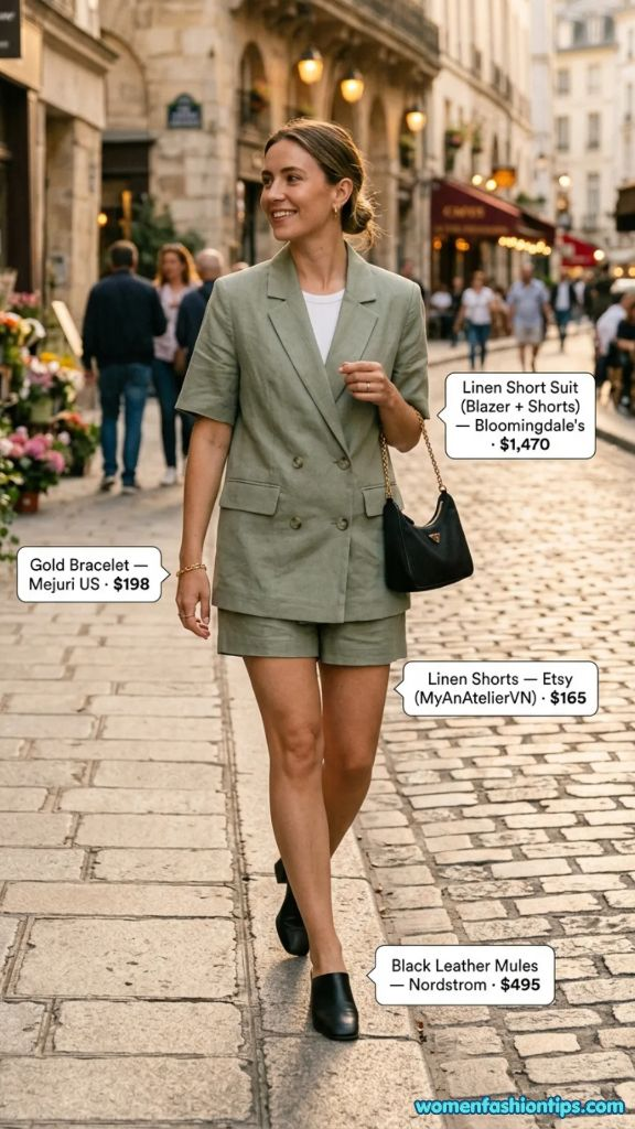 Shop This Look: The Linen Short Suit (Blazer + Shorts) is from Bloomingdale’s at $1,470 — shop it here. The Linen Shorts from Etsy (MyAnAtelierVN) at $165 — grab them here. The Gold Bracelet from Mejuri US at $198 — find it here. And the Black Leather Mules from Nordstrom at $495 — pick them up here.