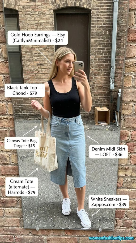 Shop This Look: The Gold Hoop Earrings are from Etsy (CaitlynMinimalist) at $24 — shop them here. The Black Tank Top from Chond at $79 — grab it here. The Canvas Tote Bag from Target at $15 — find it here. The Denim Midi Skirt from LOFT at $36 — snag it here. The Cream Tote (alternate) from Harrods at $79 — check it out here. And the White Sneakers from Zappos.com at $39 — pick them up here.