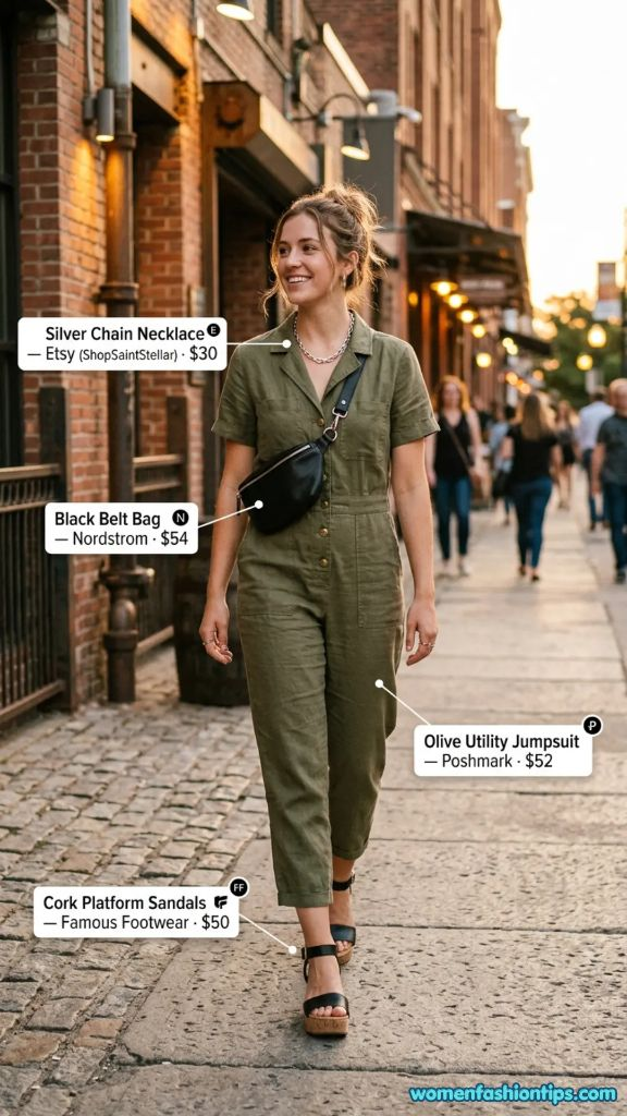 Poshmark is a treasure trove for finding unique utility jumpsuits at fraction of retail prices — the olive version featured here has that perfectly worn-in, slightly relaxed fit that new-off-the-rack pieces often take months to achieve. A belt bag from Nordstrom in black keeps your essentials close and your hands completely free, which is non-negotiable for a full day of exploring. Cork platform sandals from Famous Footwear add two to three inches of height while remaining genuinely comfortable for extended walking. A silver chain necklace from Etsy’s ShopSaintStellar pairs beautifully with the utilitarian vibe.