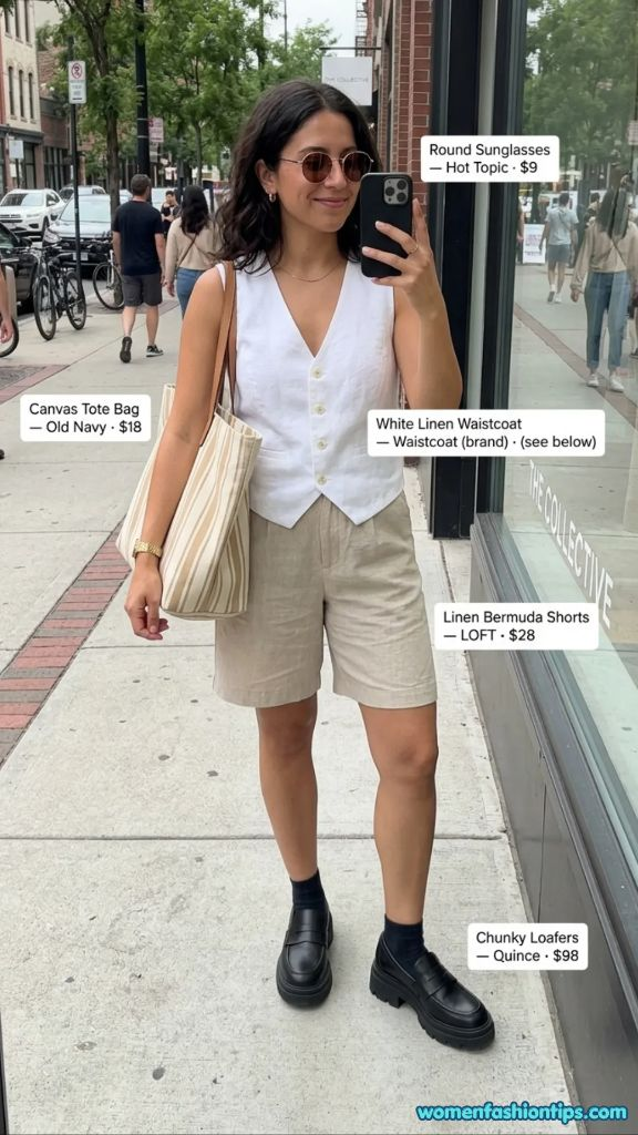 The linen waistcoat itself — look for brands that specialize in this silhouette, as the fit through the torso is everything. Bermuda shorts from LOFT in a natural linen shade offer a relaxed knee-length cut that pairs beautifully with the more structured top. Chunky loafers from Quince provide a fashion-forward edge that flat sandals simply can’t match. Round sunglasses from Hot Topic at nine dollars are a playful, budget-friendly accessory that punches well above their price point. A canvas tote from Old Navy keeps the bag situation effortless and practical.