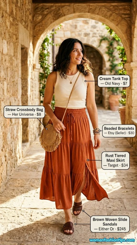Old Navy’s cream tank top at seven dollars is the foundation here — lightweight, simple, and perfectly fitted for tucking or leaving loose. Target’s rust tiered maxi skirt has a smocked waist that provides both comfort and a flattering definition at the midsection, while the tiers create beautiful movement with every step. A straw crossbody bag from Her Universe adds that handmade, artisanal quality. Beaded bracelets from an Etsy seller layer effortlessly — mix wooden beads with stone beads for visual variety. Brown woven slide sandals from Either Or offer exceptional craftsmanship and comfort.