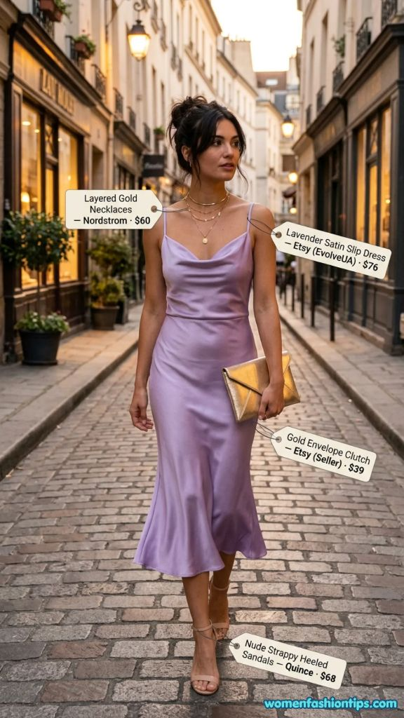 Shop This Look: The Lavender Satin Slip Dress is from Etsy (EvolveUA) at $76 — shop it here. The Layered Gold Necklaces from Nordstrom at $60 — grab them here. The Gold Envelope Clutch from Etsy (Seller) at $39 — find it here. And the Nude Strappy Heeled Sandals from Quince at $68 — pick them up here.