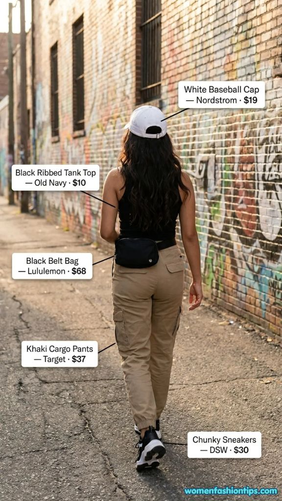 Shop This Look: The White Baseball Cap is from Nordstrom at $19 — shop it here. The Black Ribbed Tank Top from Old Navy at $10 — grab it here. The Black Belt Bag from Lululemon at $68 — find it here. The Khaki Cargo Pants from Target at $37 — snag them here. And the Chunky Sneakers from DSW at $30 — pick them up here.