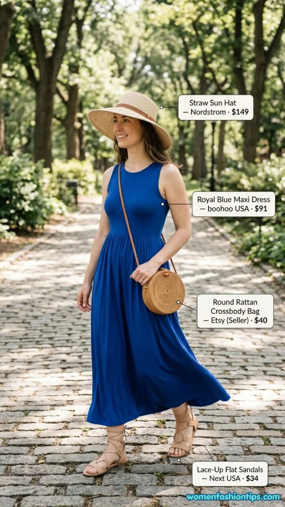 Boohoo USA carries a royal blue maxi dress that’s both affordable and genuinely well-made for its price point — the fabric has a soft jersey feel that doesn’t cling uncomfortably in the heat. A straw sun hat from Nordstrom at $149 is an investment piece you’ll use summer after summer; the quality of the weave and the structure of the brim justify the price. A round rattan crossbody bag from an Etsy seller adds that artisanal, travel-inspired detail. Lace-up flat sandals from Next USA provide a Roman-sandal aesthetic that pairs perfectly with the length of the dress.