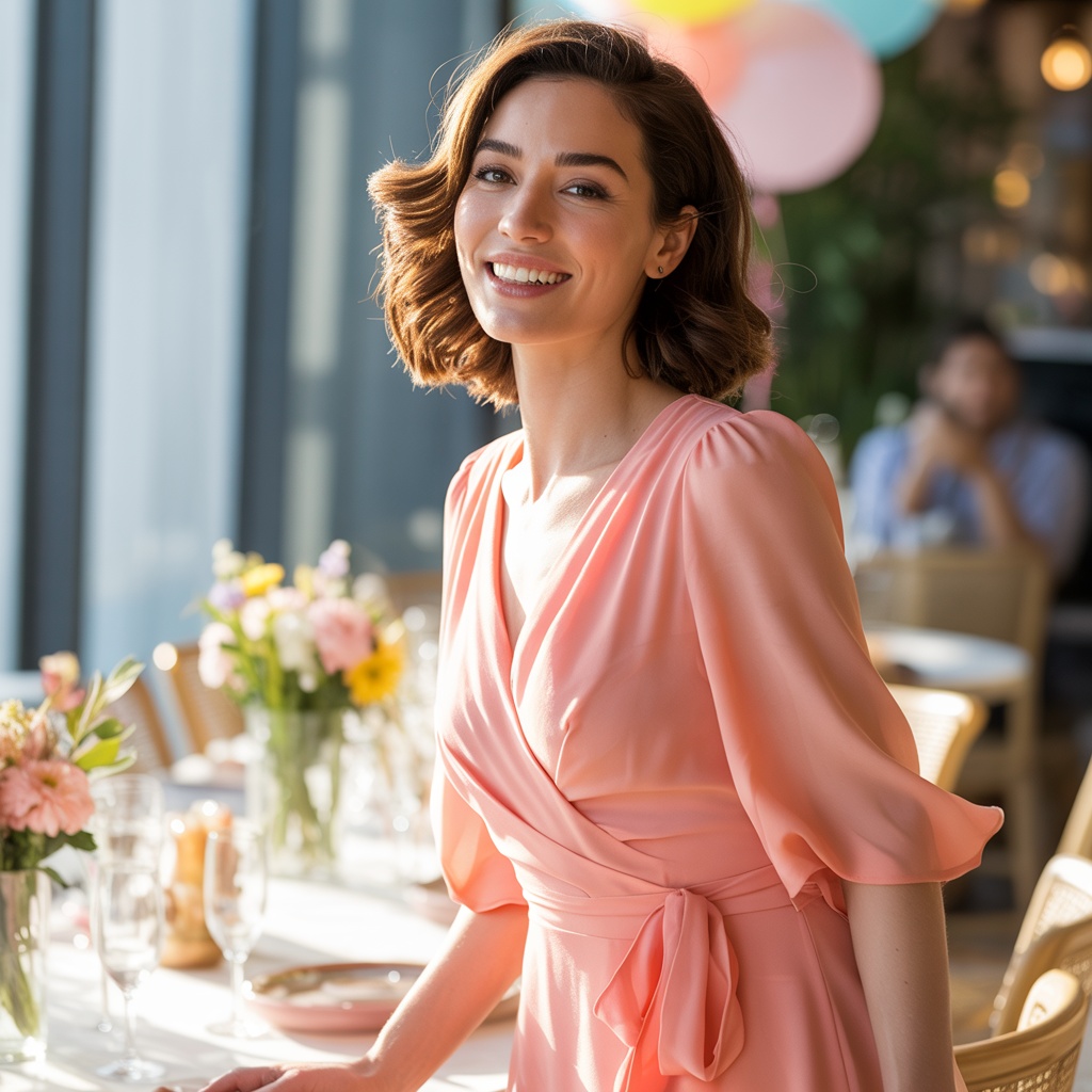 Elegant wrap dress in soft coral tone – the perfect brunch birthday party outfit