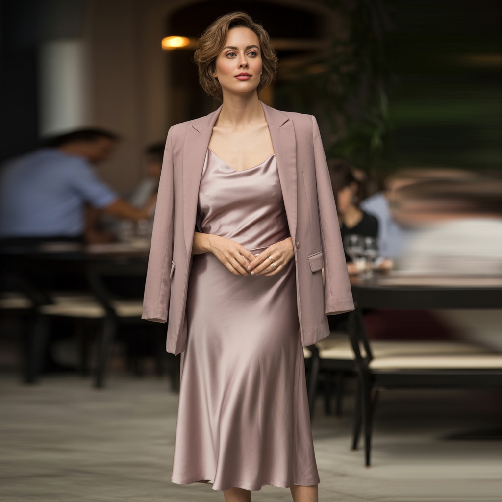 Sophisticated evening look: midi slip dress with structured blazer in dusty rose
