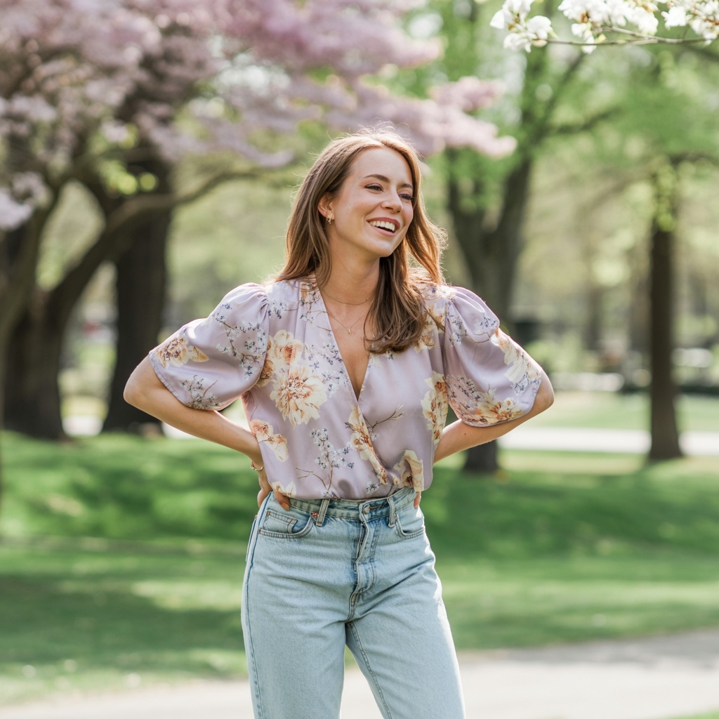 Perfect casual daytime look: high-waisted jeans with feminine floral blouse in an outdoor park setting